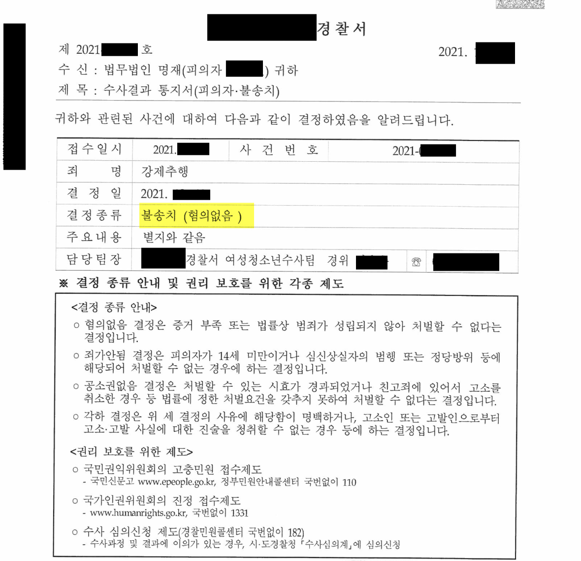 다행히 수사기관에서 위 같은 의견을 받아들여 경찰 수사결과 혐의없음으로 불송치 한다는 통지서를 받고, 빠르게 사건을 종결 시킬 수 있었습니다.