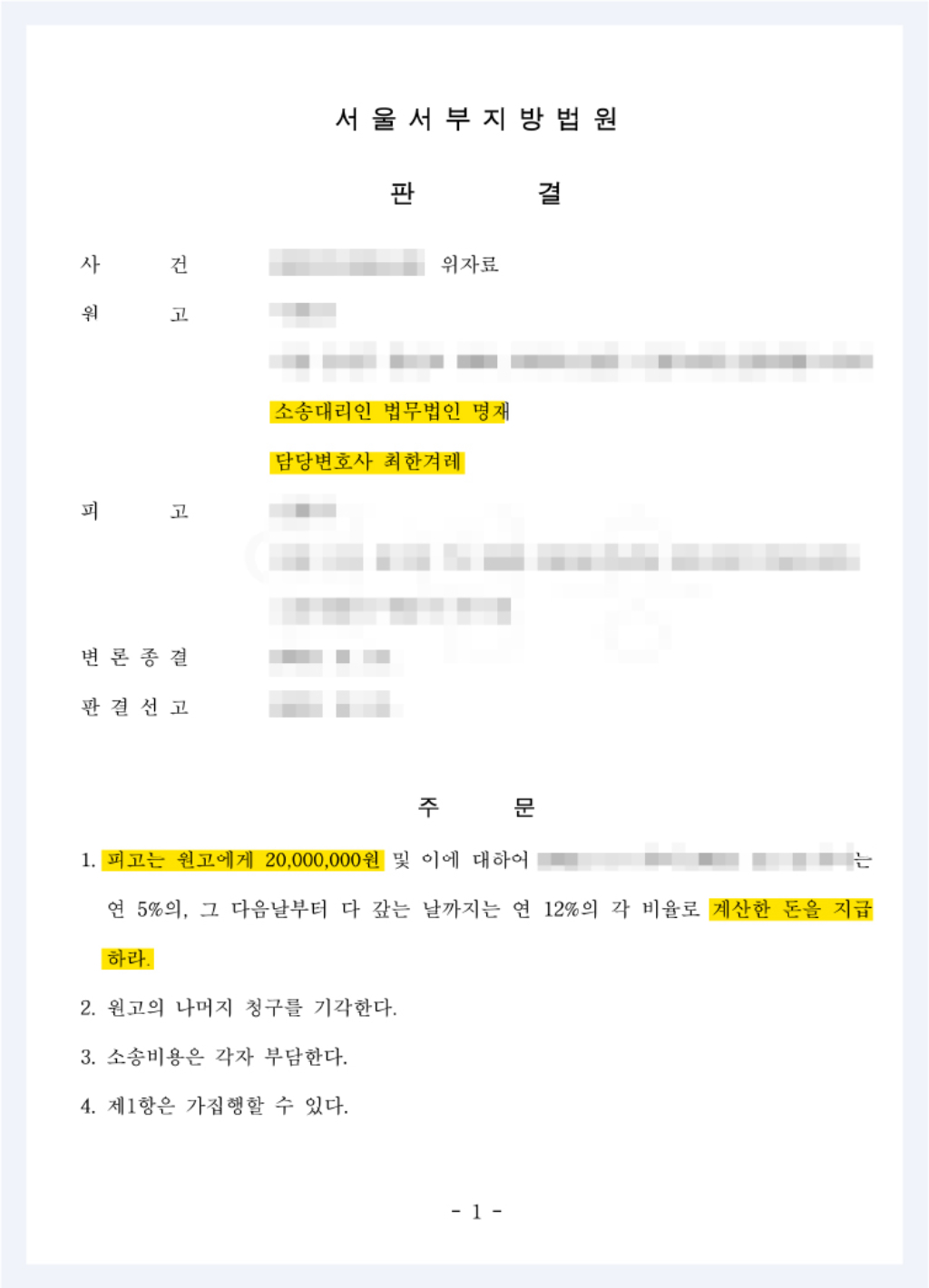 이에 비교적 짧은 만남 기간임에도 불구하고, 법원은 '피고가 의뢰인의 남편에게 배우자가 있음을 알면서도 교제하며 부정행위를 저질렀으며, 이에 따라 부부 공동생활에 미친 악영향이 크다'라는 이유로 '피고는 원고에게 2,000만 원의 위자료를 지급하라'라는 판결을 내렸습니다.