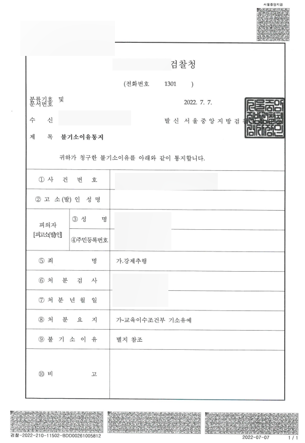피의 사실은 인정되나 피의자는 초범이고 잘못을 인정하고 반성하고 있는 점, 피해자가 피의자에 대한 처벌을 원치 않는다는 점을 참작하여 성폭력재범방지교육 이수를 조건으로 기소유예 처분