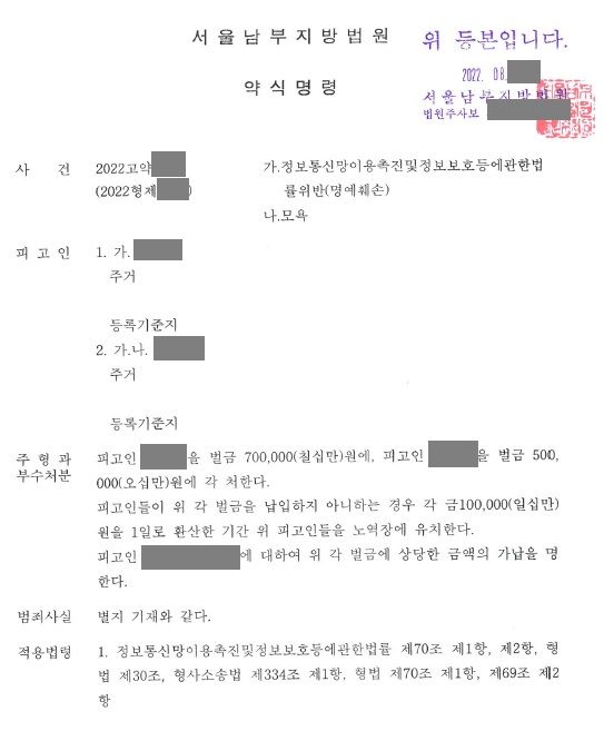 의뢰인의 폭행 혐의에 대해 경찰은 불송치결정(무혐의)을 하였고, 의뢰인이 고소한 사건에 대하여는 법원은 정보통신망법위반(명예훼손), 모욕 혐의를 인정하면서 벌금 50~70만원을 선고하였습니다.