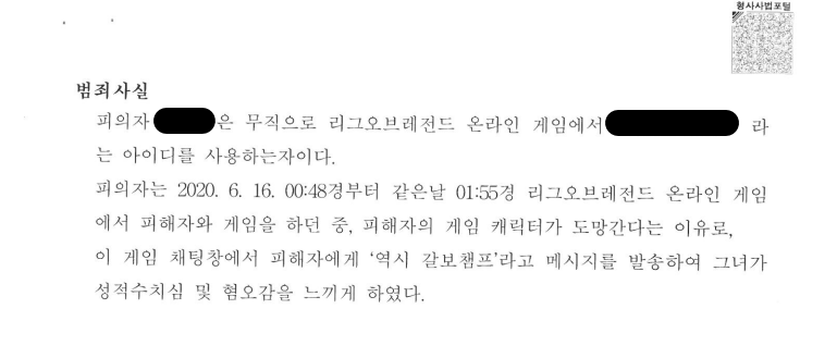 실제 A는 게임 중 "역시 갈보 챔프"라는 메세지를 1회 보냈을 뿐 그 외에 성적인 비하 발언은 없었습니다. 심지어 A는 '갈보'라는 단어를 비난 목적으로 사용했으나, 그 의미가 성적인 비하 발언인지도 모르고 했음에도 혐의가 인정되어 검찰에 송치 되었는데요. 상대방의 성별이 여성인 것도 몰랐고 알아갈 생각조차 없이 그저 해당 게임 플레이중 소심한 플레이에 대해 비난하고자 적었던 단어로 상대방이 성적수치심을 느꼈기에 혐의가 인정된 것입니다.