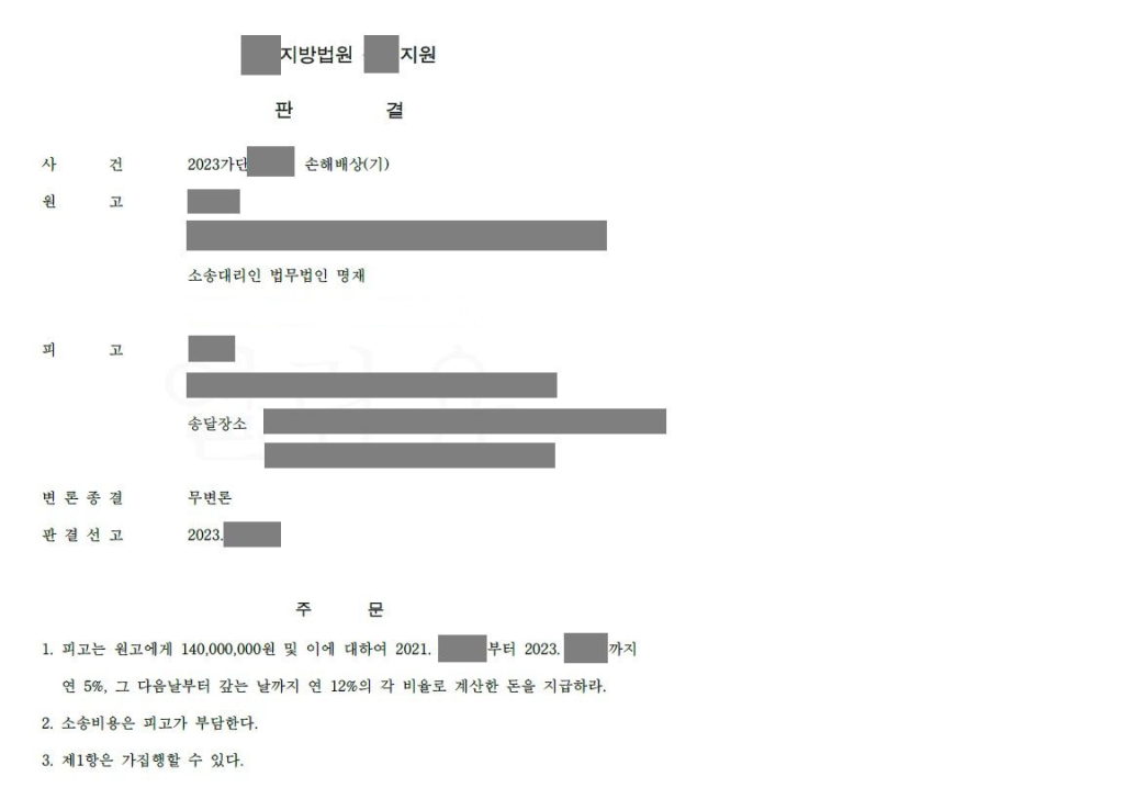 법원은 법무법인 명재의 청구를 전부 인정하고 소가 1억 4천만원에 대하여 원고 전부 승소 판결을 내렸습니다. 보이스피싱 조직원들이 추가로 검거되는 대로 손해배상을 계속 청구할 예정입니다.
