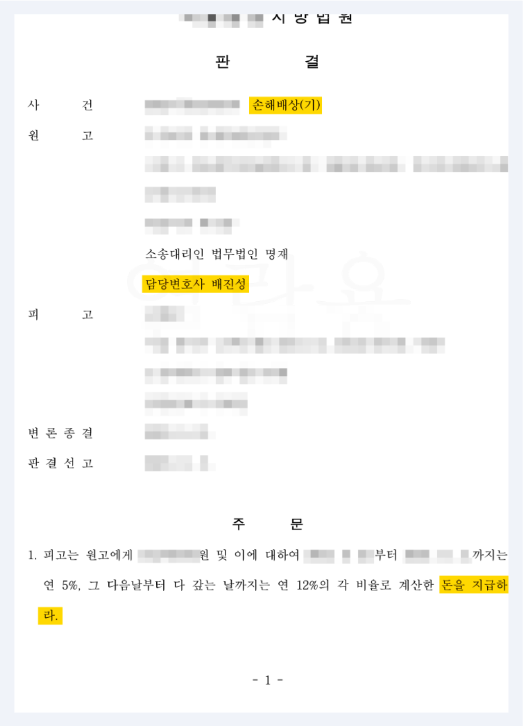 배진성 변호사의 꼼꼼한 변론으로 피고는 손해배상금 지급 판결을 받았습니다.