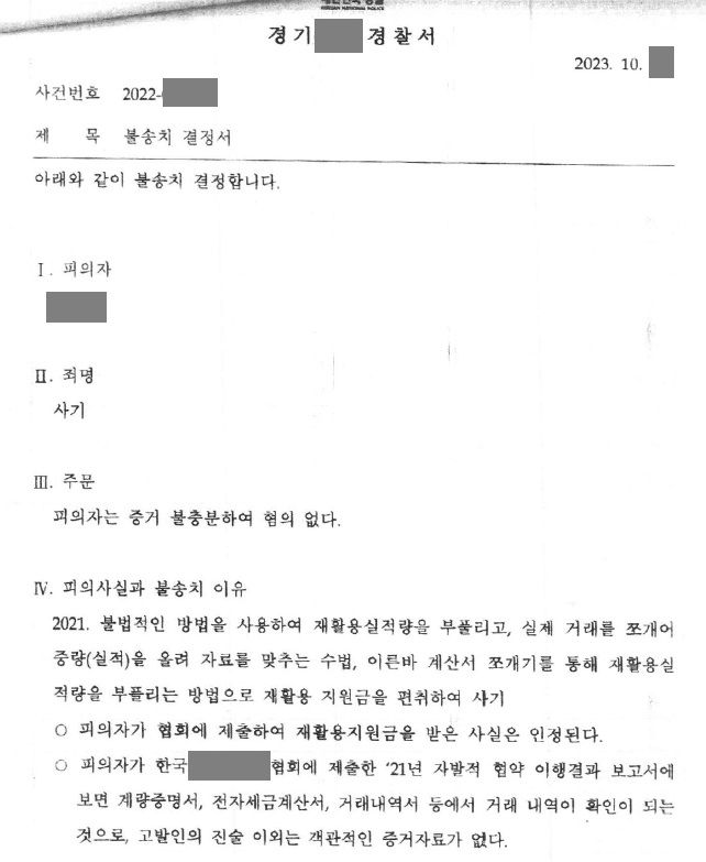 그러나 법무법인 명재의 변론으로 경쟁업체(원고)가 패소하고 의뢰인의 업체(피고)가 승소하게 되자, 이번에는 부당하게 재활용 지원금을 편취한 것이 사기라면서 사기죄로 형사 고발까지 당하게 되어 다시 법무법인 명재를 찾아오게 되었습니다.