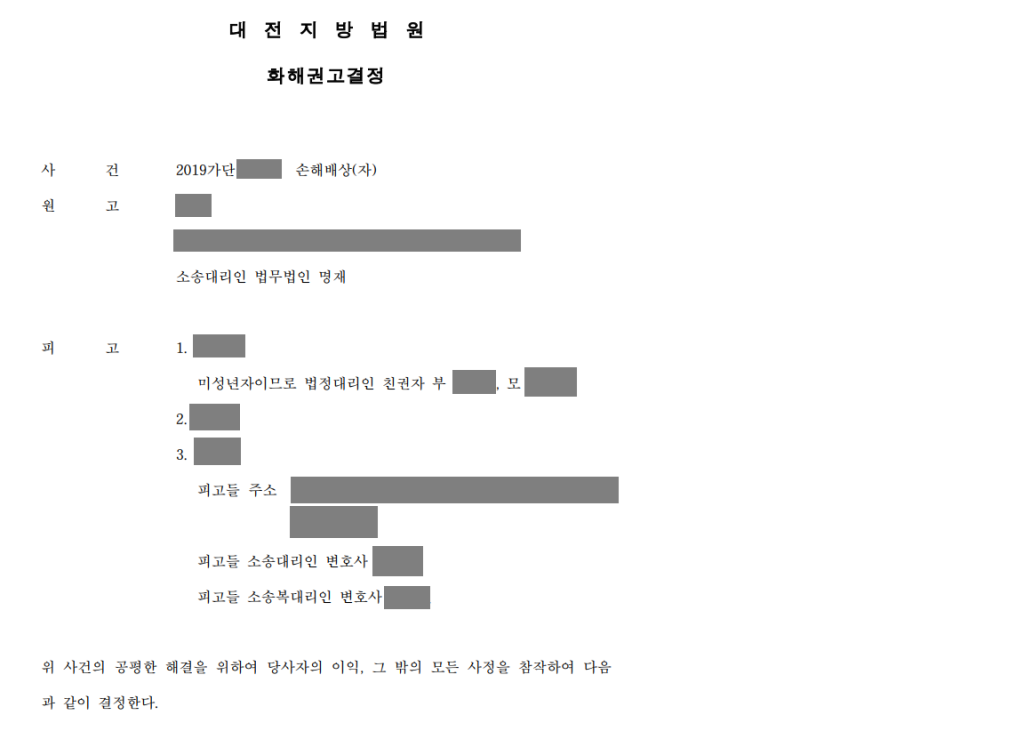 가해자인 미성년자는 소년원에 가게 되었고, 의뢰인은 법원의 화해권고를 받아들여 7,000만원의 손해배상을 받게 되었습니다. 사고로부터 약 2년이라는 긴 시간이 소요되었지만 가해자는 합당한 처벌을 받고 의뢰인은 합당한 보상을 받을 수 있었습니다.