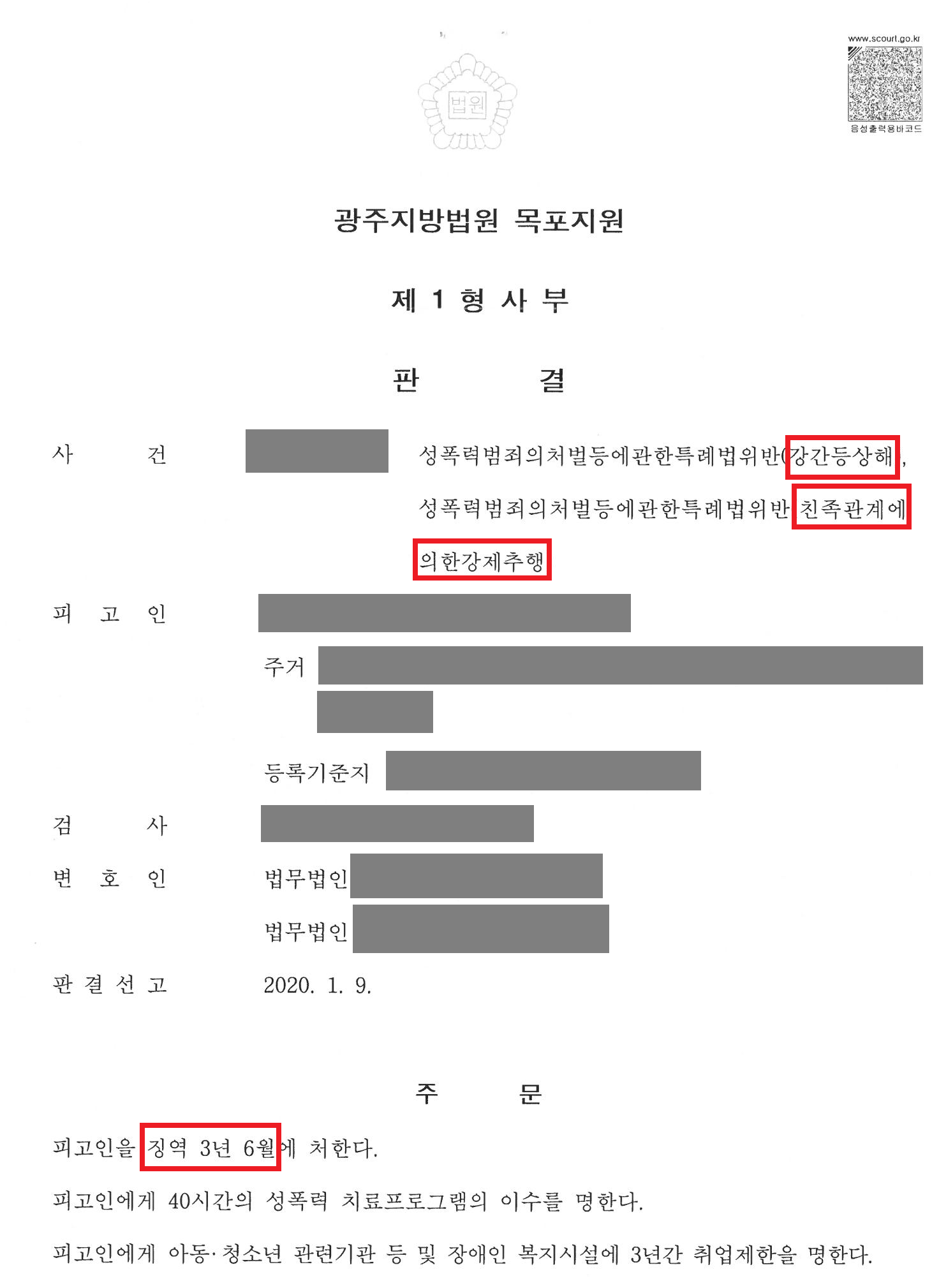 법원은 가해자에게 친족관계에 의한 강제추행 2회, 강간하려다 미수에 그치고 피해자에게 전치 2주의 상해를 입혔다는 혐의를 모두 인정하고 가해자에게 징역 3년 6월을 선고하였습니다. 가해자는 유죄 판결에 불복하여 항소하였으나 모두 기각되어 현재 3년 6개월의 수감생활을 보내고 있습니다.