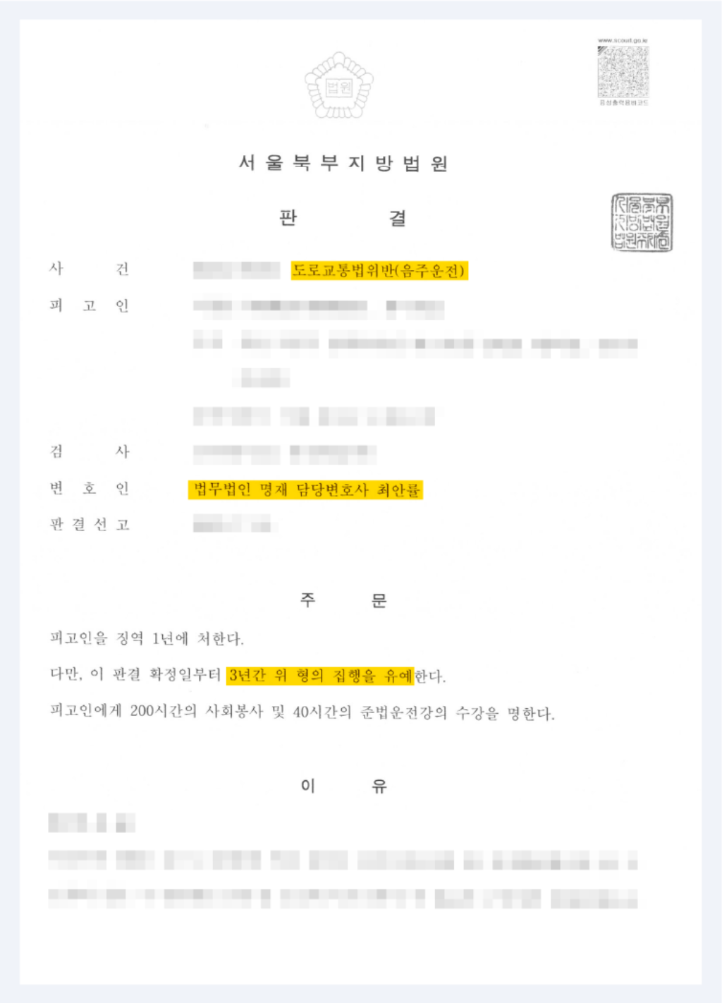 실질적인 해결 방안을 제안한 최안률 변호사의 변론으로 자칫 실형을 선고받을 수 있던 의뢰인은 다행히 집행유예로 방어에 성공할 수 있었습니다.