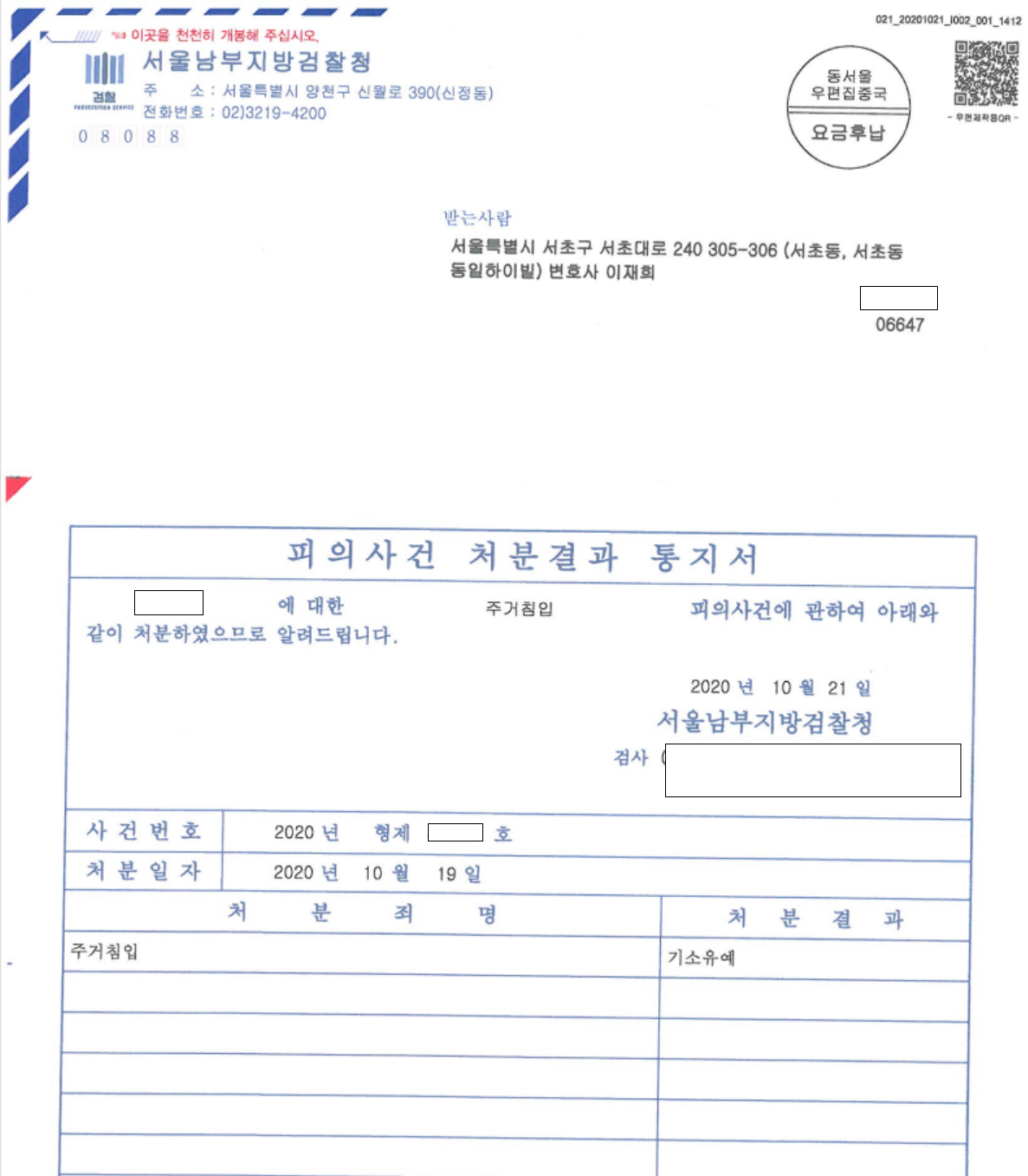 [주거침입] 피해자와 합의 없이 기소유예 받은 사례