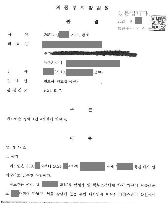 가해자인 학원 강사는 자신이 서울대학교 치과대학에 다녔고 서울 강남에 위치한 유명 입시학원인 메가스터디 학원에서 오랫동안 근무하여 경험이 풍부한 것처럼 거짓말을 하여 자신을 신뢰하게 한 후, 학부모들에게 대학입시 컨설팅을 해주겠다며 고액의 돈을 받았습니다. 피해자인 의뢰인은 자녀 교육에 관심이 많은 학부모로 그 강사의 말을 믿고 4개월에 걸쳐 7,240만원을 송금하였는데, 그 강사가 잠적하였다는 소식을 듣고 또 자신과 같은 피해를 입은 학부모가 여러 명이라는 사실을 알게 되자 법적 조치를 위해 법무법인 명재를 찾아오게 되었습니다.