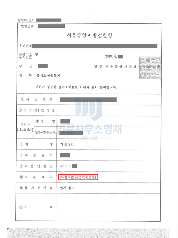 검찰은 법무법인 명재의 변론을 받아들여 의뢰인에 대한 준강간 혐의에 대해 불기소처분을 하였습니다. 덕분에 의뢰인은 하룻밤 잠자리로 인해 억울하게 성범죄자가 될 수 있는 위기에서 벗어날 수 있었습니다.