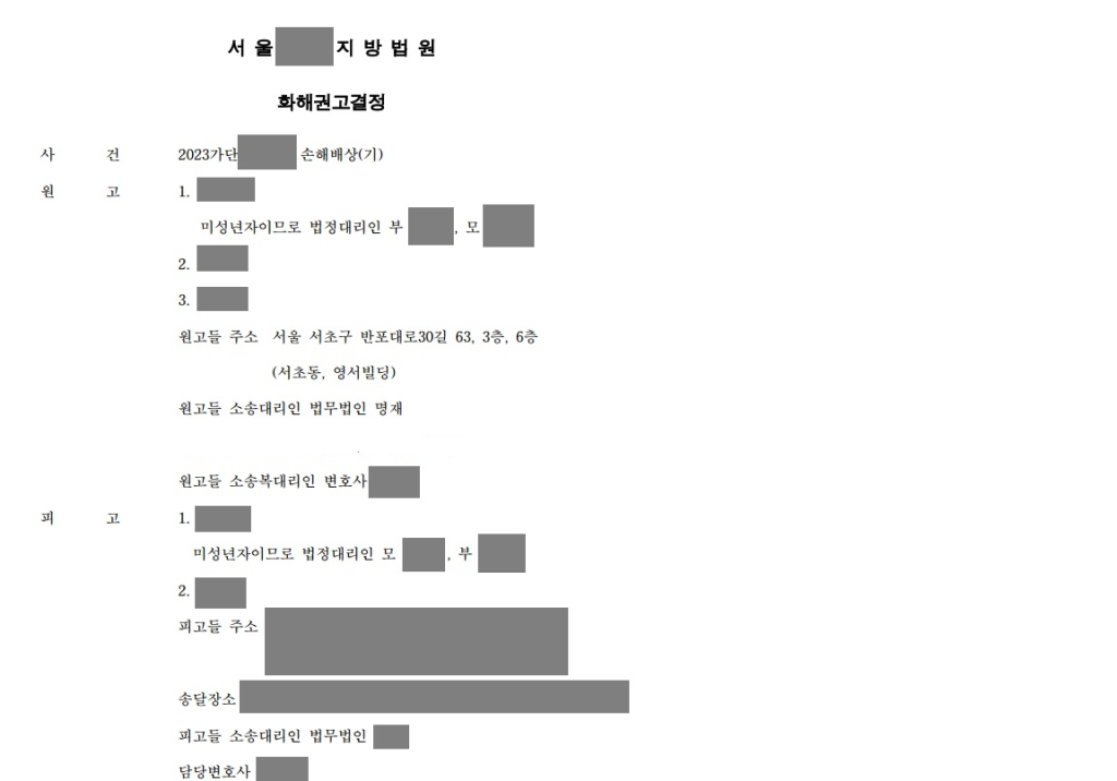 법원은 상해로 인한 불법행위를 인정하면서 피해 학생에 대하여는 500만원, 피해 학생의 부모님에 대하여는 각 100만원씩의 배상금을 인정하였습니다. 소송 전에 합의가 이루어지지 않아 결국 소송을 제기하여 화해권고결정을 받은 사건이었습니다.