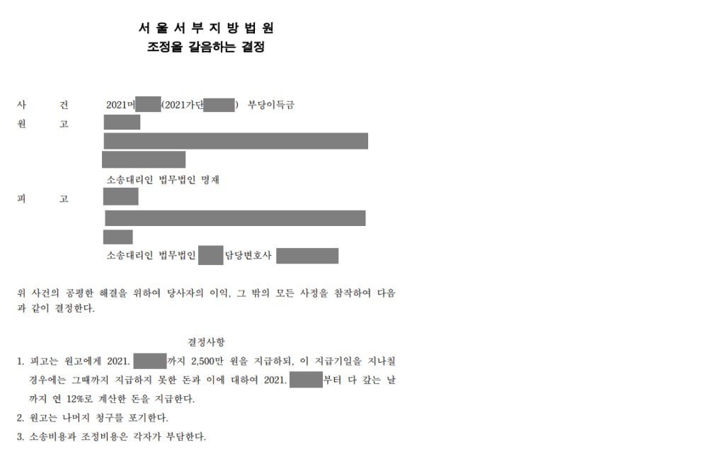 법원은 매도인에게 2,500만원을 반환하라는 내용의 화해권고 결정을 하였습니다. 의뢰인은 법원의 중재를 수용하였고 덕분에 계약 의사를 번복했다가 큰돈을 손해 볼 뻔한 위기에서 벗어나 피해를 줄일 수 있게 되었습니다.