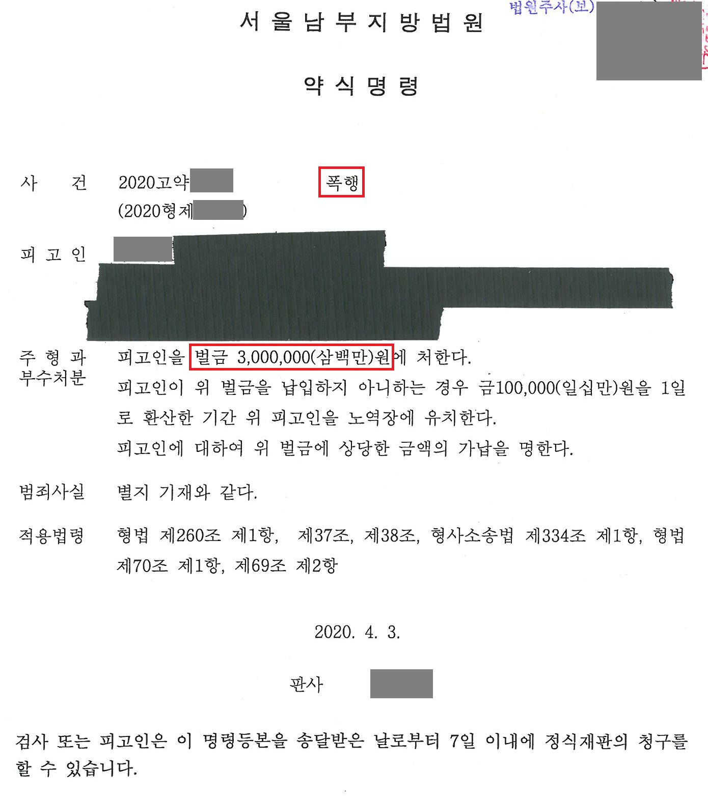 검찰은 가해자의 폭행 혐의를 인정하여 벌금 300만원에 구약식 처분을 하였습니다. 폭행으로 인한 병원 치료 내역도 하나 없는 상황에서 가해자의 처벌을 이끌어내었고, 덕분에 의뢰인은 민사소송을 제기하여 손해배상 청구도 진행할 수 있게 되었습니다.