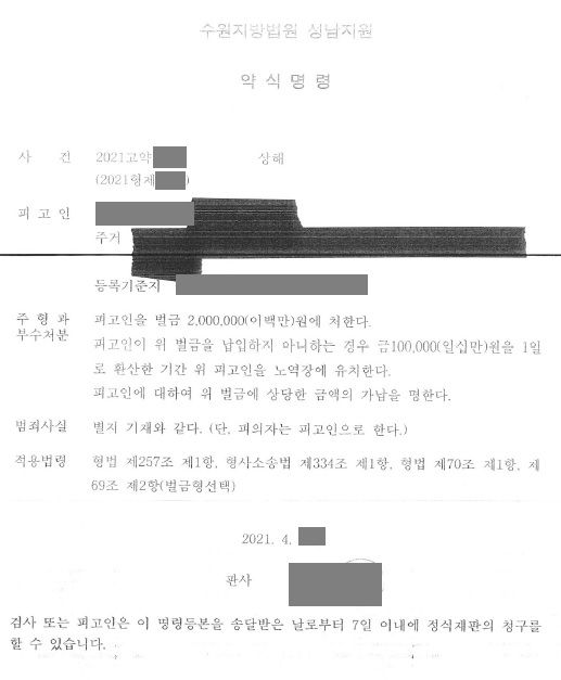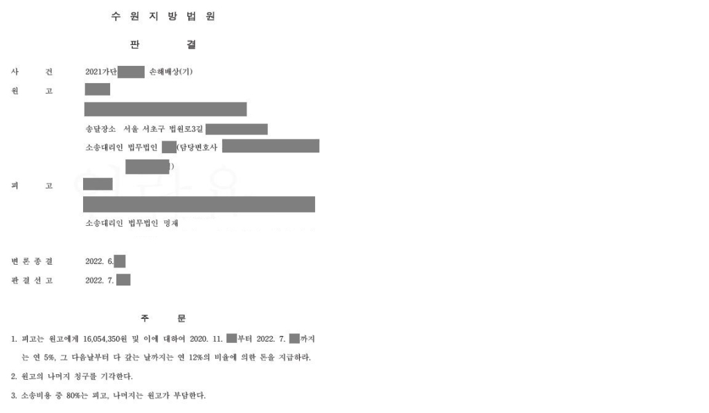 법원은 상해죄를 유죄로 인정하고 벌금 200만원을 선고하였습니다. 이는 고소인 얼굴에 흉터가 남게 되었다는 점 등을 고려하더라도 무척 선처를 받은 것이었고, 민사소송에서는 고소인이 지출한 치료 비용 400만원 외에 위자료 1,200만원이 인정되어 총 1,600만원의 손해배상을 해주게 되었습니다.