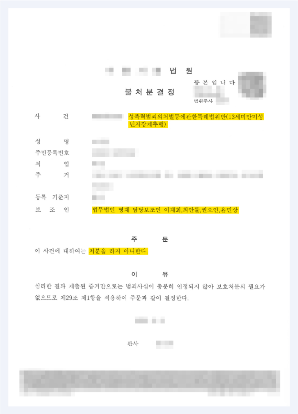 이 변호사는 가정법원에서 전체 기록 열람 허가(등사 불허)를 받아, 하루종일 가정법원 열람실에 앉아 피해 아동 진술을 철저히 분석하며 보조인 의견서를 작성했습니다.