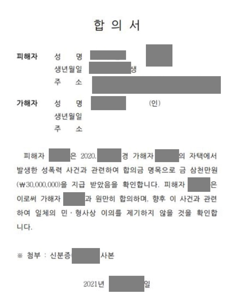 계속되는 논리적인 주장 및 공격에 결국 가해자는 준강간 사실을 시인하였고, 의뢰인은 합의금으로 3,000만원을 지급받아 형사고소나 추가적인 민사 손해배상 청구 없이 사건을 마무리 지을 수 있었습니다. 이로써 의뢰인은 조금이나마 마음의 위로를 받을 수 있었습니다.