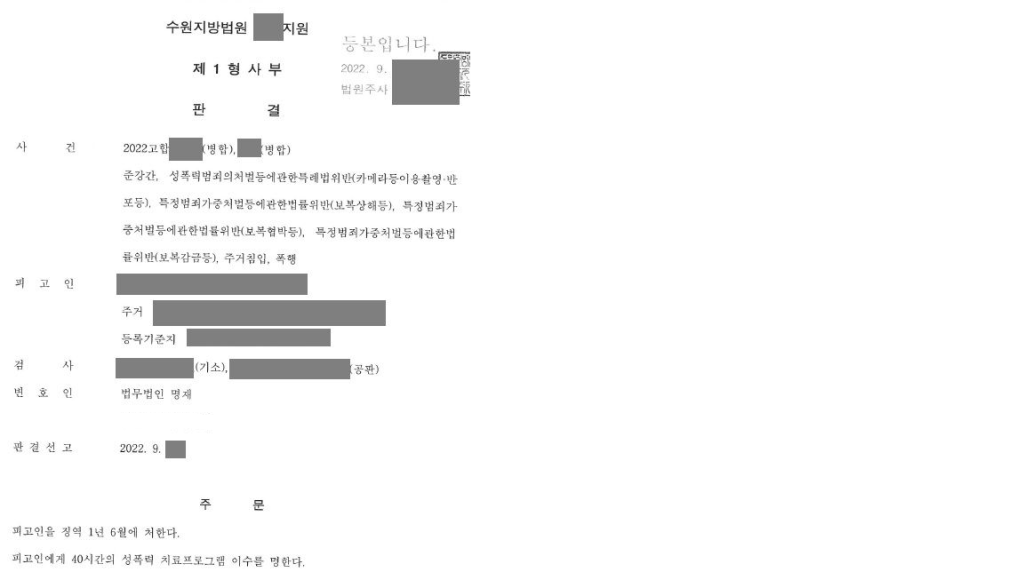 법원은 의뢰인에게 징역 1년 6월, 40시간의 성폭력 치료프로그램 이수를 선고하였습니다. 의뢰인에 대한 법률상 처단형은 징역 22년 6개월까지 가능한 상황이었으나, 최대한의 합의를 통해 양형기준표에 의한 최소한의 형으로 선처를 받은 것이었습니다.