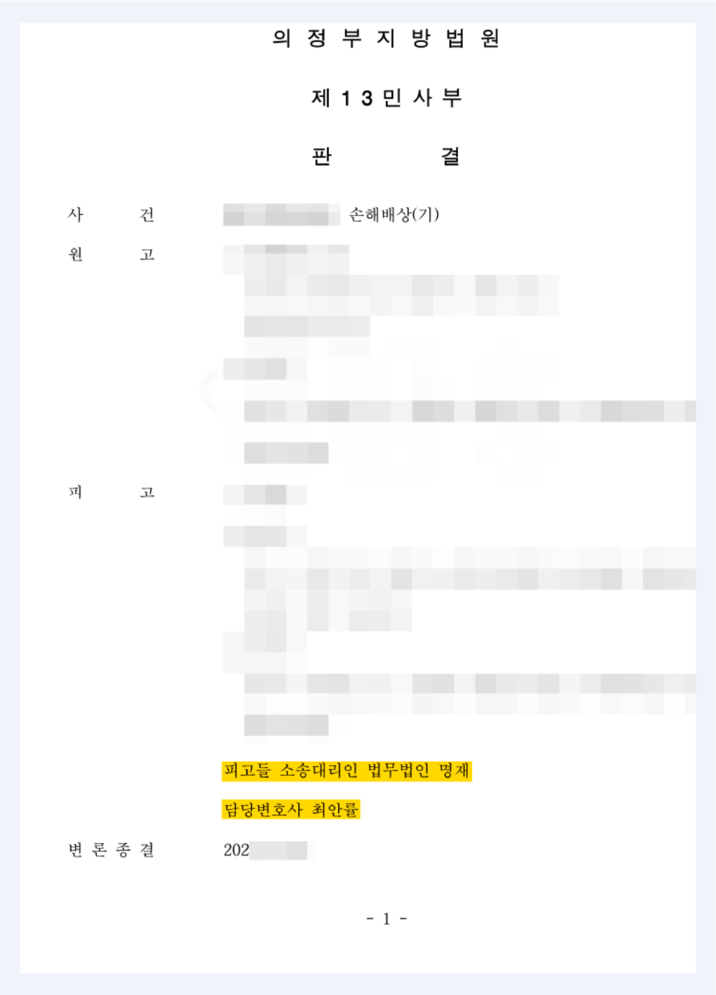 최안률 변호사의 명명백백한 주장으로 원고의 일부 청구에 대하여는 기각되었으며, 손해배상금액을 크게 줄일 수 있었습니다.