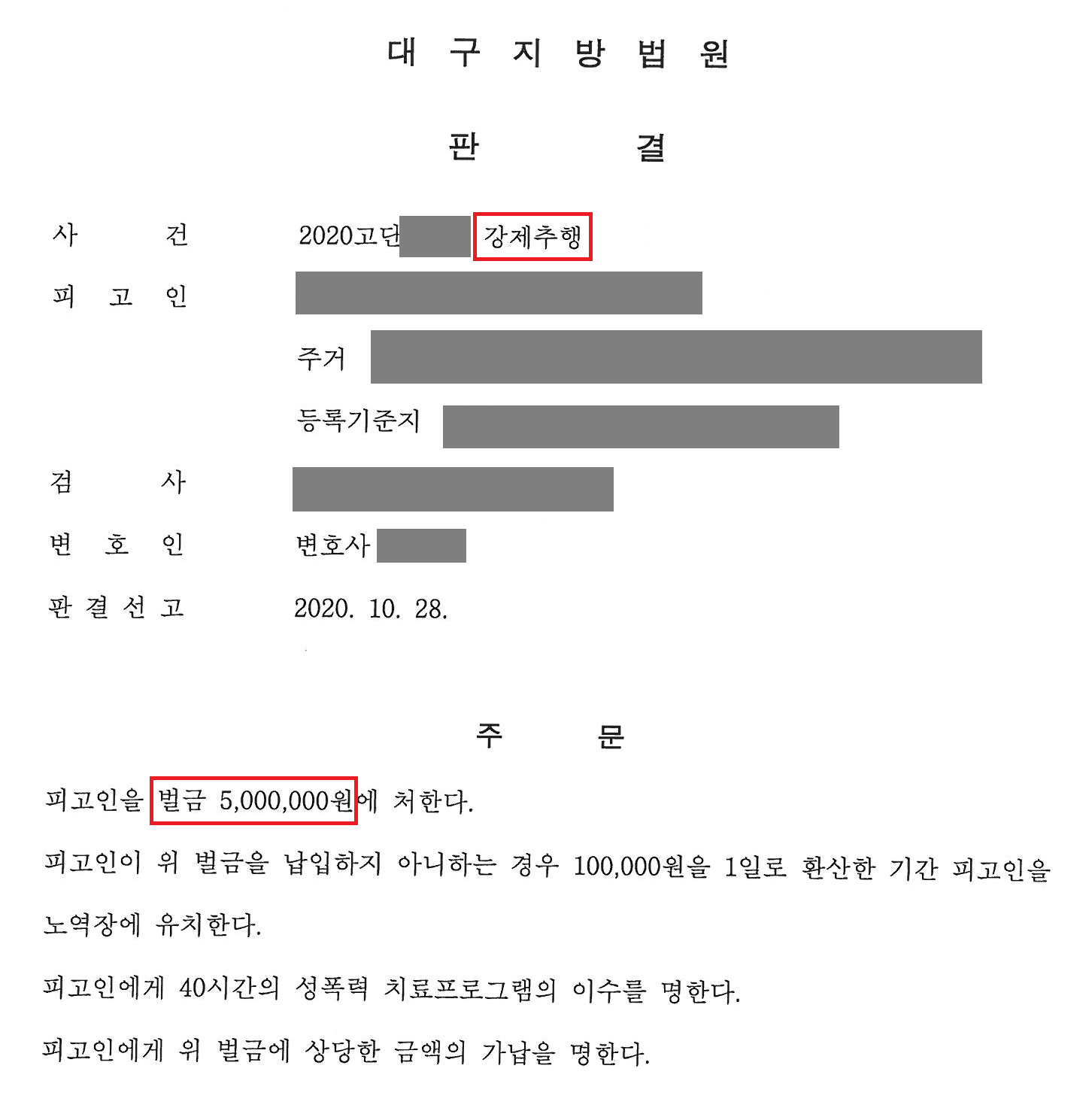 법원은 가해자에게 강제추행 혐의를 인정하고 벌금 500만원, 40시간의 성폭력 치료강의 수강을 선고하였습니다. 그리고 의뢰인은 재판 과정에서 가해자와 합의하고 1,000만원의 합의금을 수령하여 피해 회복을 할 수 있었습니다.