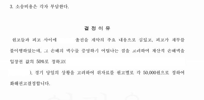 법원은 피고의 채무불이행을 인정했습니다. 다만, 손해액을 직접적으로 증명하기 어려운 점 등을 고려하여 티켓값의 50%와 위자료 50,000원을 손해액으로 인정하는 화해권고결정을 내렸습니다. 피고는 법원의 화해권고결정에 이의를 제기하지 않았고 해당 사건은 법원의 결정대로 확정되었습니다.