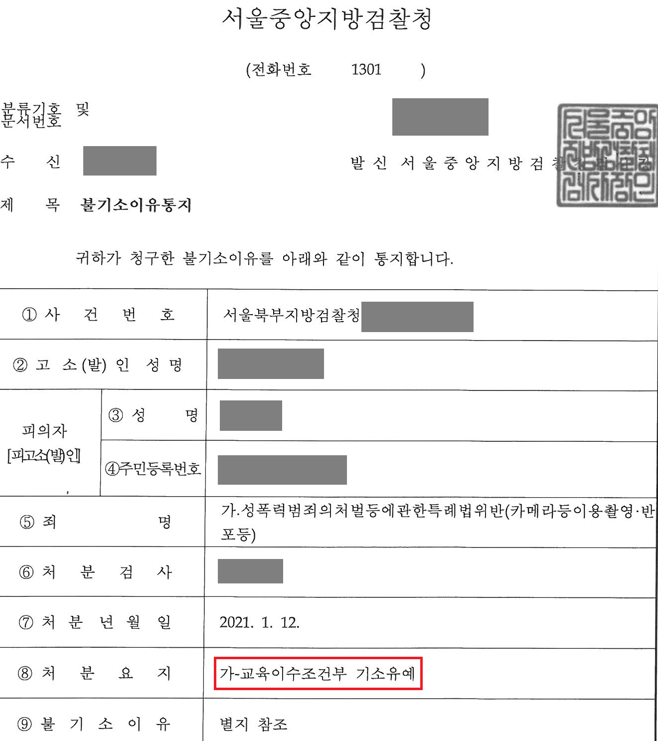 검찰은 의뢰인이 자신의 잘못을 반성하면서 부적절한 성적 취향을 고치겠다는 의지를 보이고 있다는 점, 피해자와 500만원에 합의가 되었다는 점을 고려하여 성폭력사범 재범방지 교육 프로그램을 이수하는 조건으로 의뢰인에게 기소유예 처분을 하였습니다.