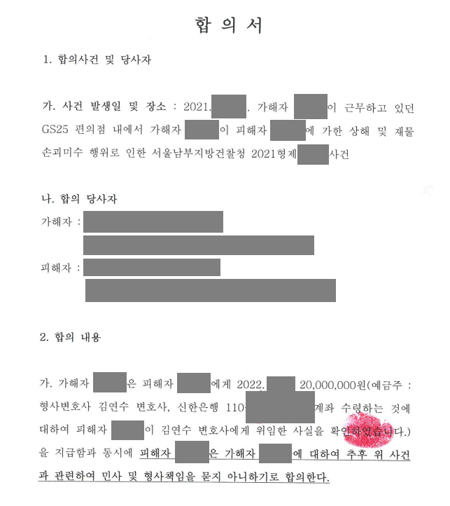 법무법인 명재는 가해자인 점원 측과 2,000만원에 합의를 하였고 쌍방폭행 사건에 대해서도 처벌불원서를 받았습니다. 덕분에 의뢰인은 안와골절 피해에 대해서 충분한 보상을 받으면서도, 의뢰인이 피의자가 된 쌍방폭행 사건 역시 공소권없음 처분으로 종결될 수 있었습니다.