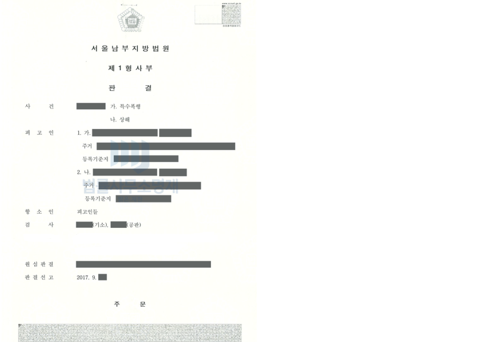 의뢰인은 친구와 함께 유흥업소를 방문하였다가, 친구가 옆자리에 앉아있던 여성 접객원을 폭행하는 것에 의뢰인도 가담하였다는 혐의로 특수폭행죄 및 상해죄에 대한 피고인이 되어 재판을 받게 되었습니다. 의뢰인은 이미 여러 차례의 폭력 범죄 전과가 있었고, 더구나 사건 당시에는 성범죄로 인한 집행유예 기간이었기 때문에 이 사건의 유죄판결이 확정되면 과거의 성범죄로 인한 집행유예까지 취소될 수 있는 상황이었습니다.